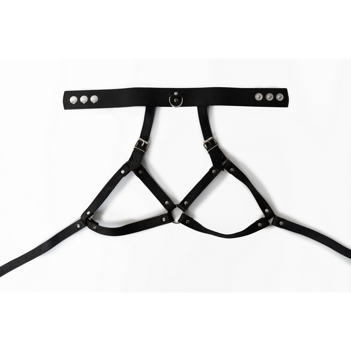 Сбруя выполнена из натуральной мягкой черной кожи.  Ошейник с нежным подкладом позволяет чувствовать себя максимально комфортно, ширина ошейника 4 см, а размер удобно регулируется тремя кнопками и подойдет на обхват шеи от 33 до 36 см. Лиф выполнен из кожаных ремешков и отлично приподнимает грудь, придавая женским формам еще большую привлекательность. Сексуальный аксессуар не оставит равнодушным ни одного партнера. Подойдет на размены S, M.